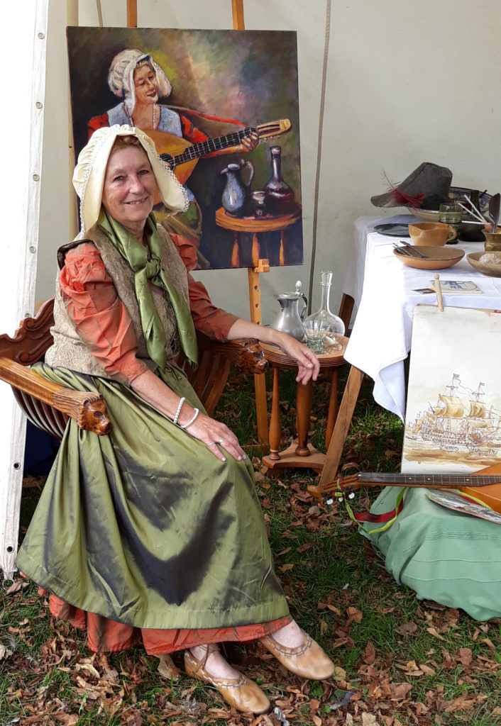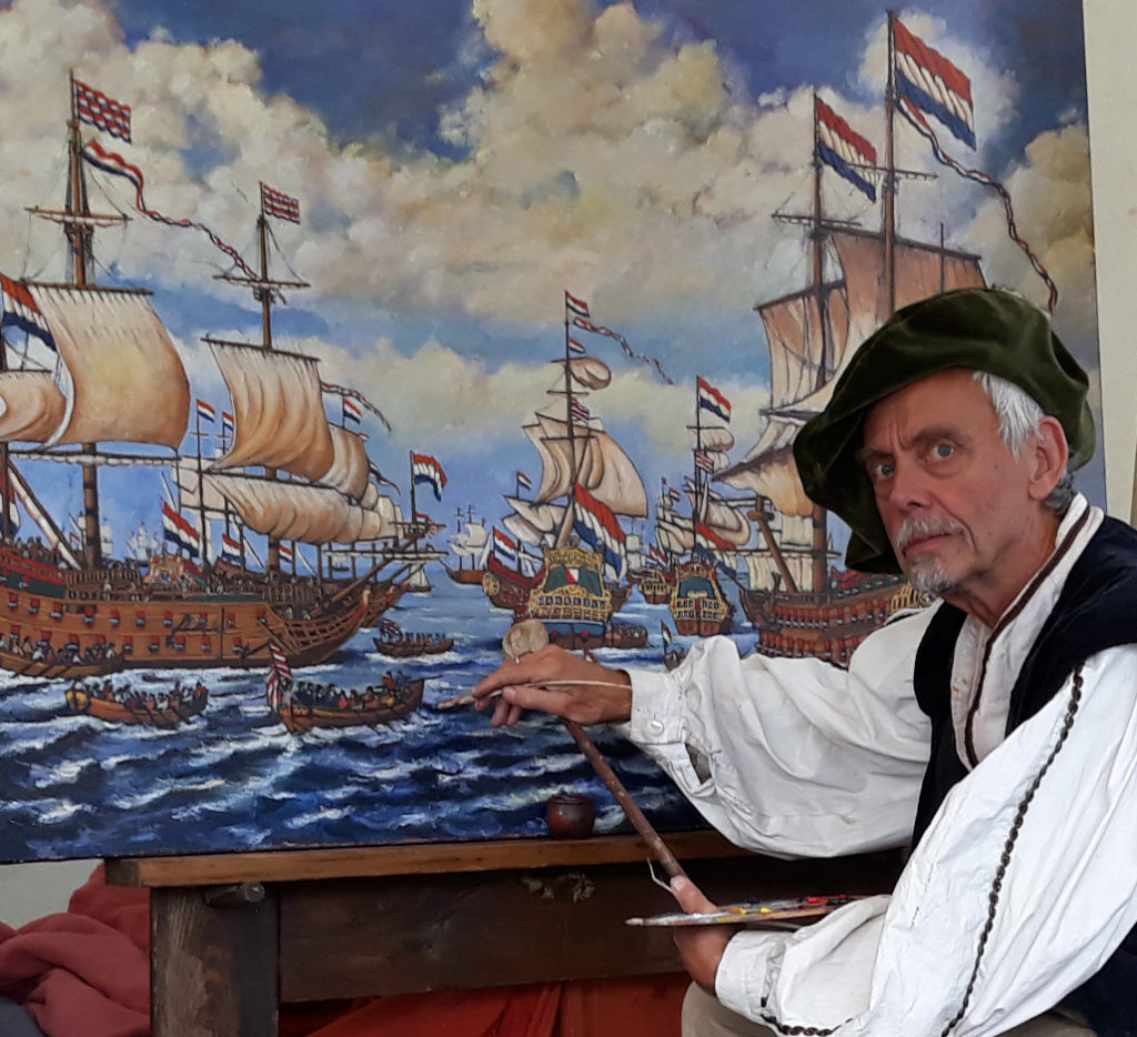 Dit weekend (12/13 september 2019) werd in Den Haag het Hollands Historisch Festijn gehouden. Een mooi evenement op een prachtige lokatie. Het weer was natuurlijk buitengewoon mooi, waardoor alle georganiseerde activiteiten mooi uitkwamen en er zeer veel bezoekers waren. Niet in de laatste plaats ook door het samenvallen met Monumentendag en de generale repetities met ruiters en koetsen voor Prinsjesdag. Het kampement bij de Hofvijver was zodanig opgesteld dat er een tijdlijn was gemaakt die liep van Vikingen t/m de 20e eeuw (100 jaar Vrouwenkiesrecht; een eye-opener voor sommige toeristen). Wij vertegenwoordigden de schilders van de GOUDEN EEUW (jazeker, u leest het goed!). Jammer was dat van de luit twee snaren gesprongen waren zodat er niet gespeeld en gezongen kon worden. Het grote schilderij is “De krijgsraad aan boord van de De Zeven Provinciën”, het admiraalschip van Michiel Adriaensz de Ruyter, 10 juni 1666. Het is gebaseerd op de tekening/grisaille van Willem van de Velde de Oude, die hij omstreeks 1666-1667 heeft gemaakt. Ik ben lang geleden begonnen aan dit schilderij en het is door al onze overige activiteiten nog niet veel verder gekomen. Veel details en enkele glaceerlagen (om de tonen te temperen) moeten nog volgen. Eerst maar eens met pensioen gaan 🙂 ?